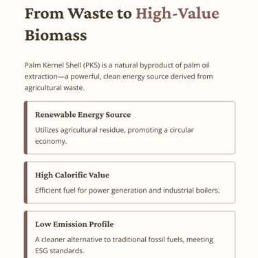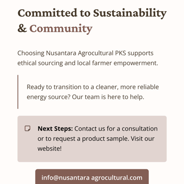 Nusantara Agrocultural is a leading supplier of rice husk and Palm Kernel Shell (PKS) sourced from Indonesia. We specialize in manufacturing high-quality products derived from rice husk and EFB, working with more than 10 rice milling factories and 2 palm oil processing factories. Established in early 2024, we are a young company driven by a strong commitment to delivering the best products for our customers. Despite our recent formation, our team works tirelessly to innovate and create sustainable solutions. We aim to improve the welfare of local farmers by transforming what was once considered waste into valuable products, thus generating additional income for the farming community.
